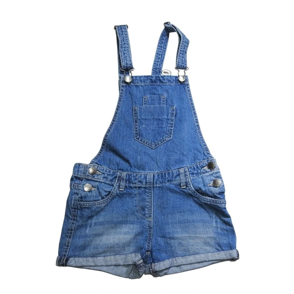 Kék, koptatott stílusú rövid kertészfarmer állítható derékbőséggel.