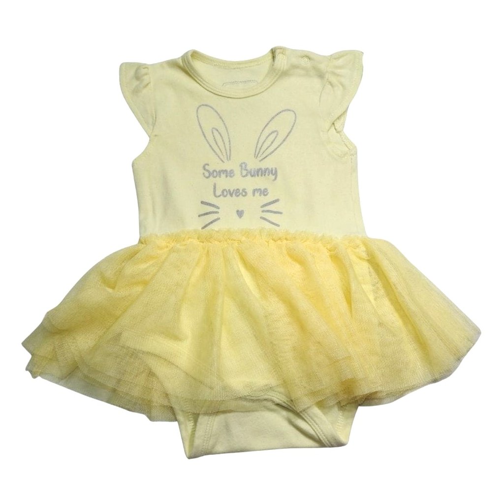 Halvány sárga ujjatlan, pamut body tüllös szoknyával, nyuszis mintával, felirattal.
