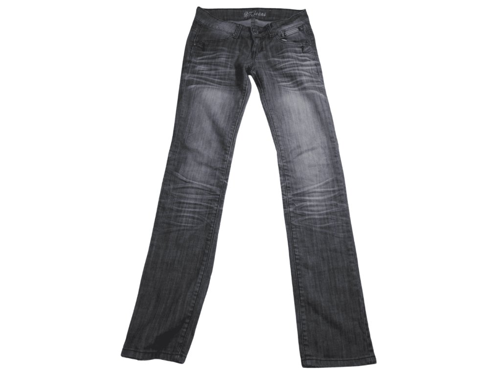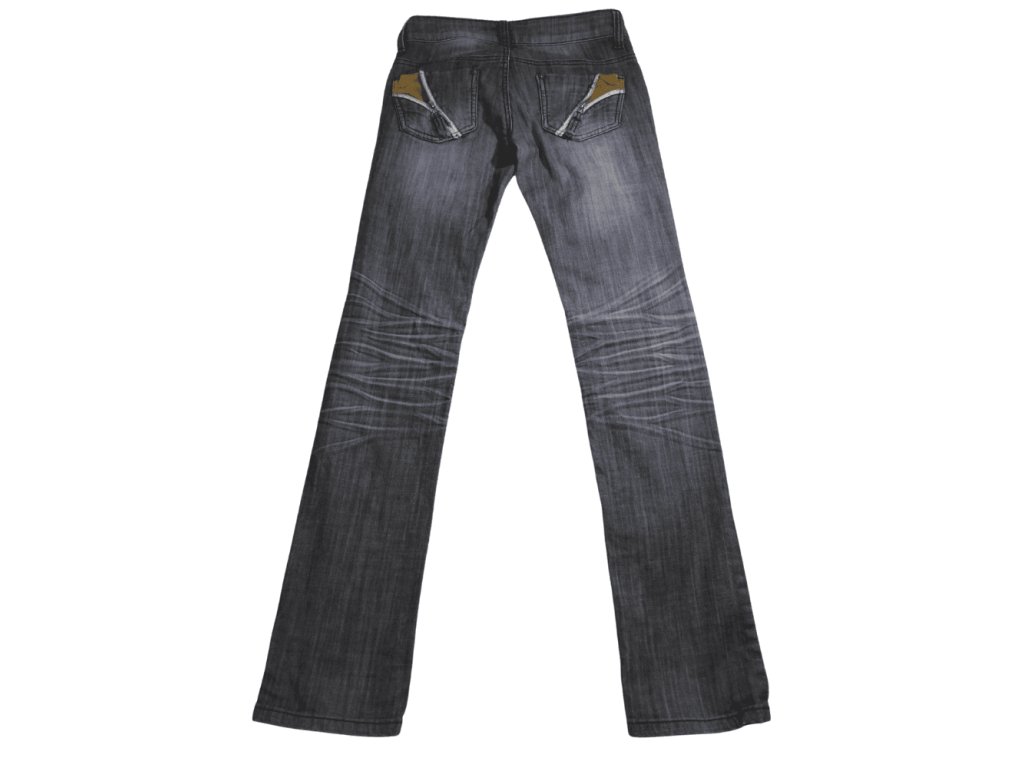 Szürke, koptatott, szűkülő szárú farmernadrág.