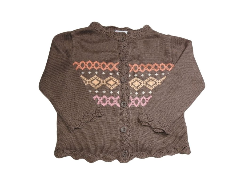 Sötétbarna, kötött kardigán motívumokkal.