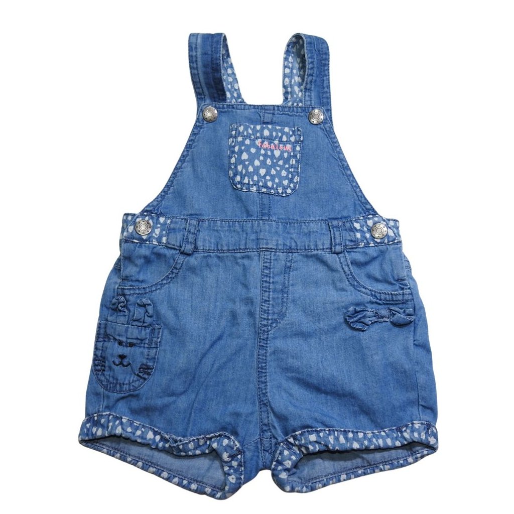Kék, farmerhatású kantáros rövidnadrág cicás zsebbel, masnival és szíves mintával.