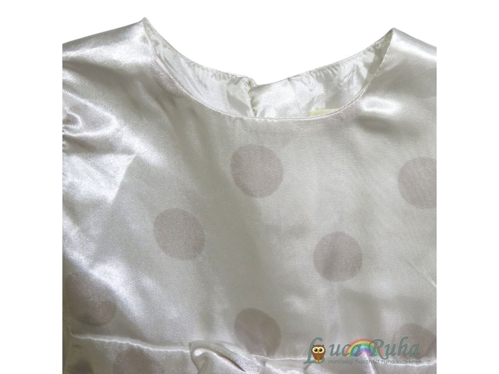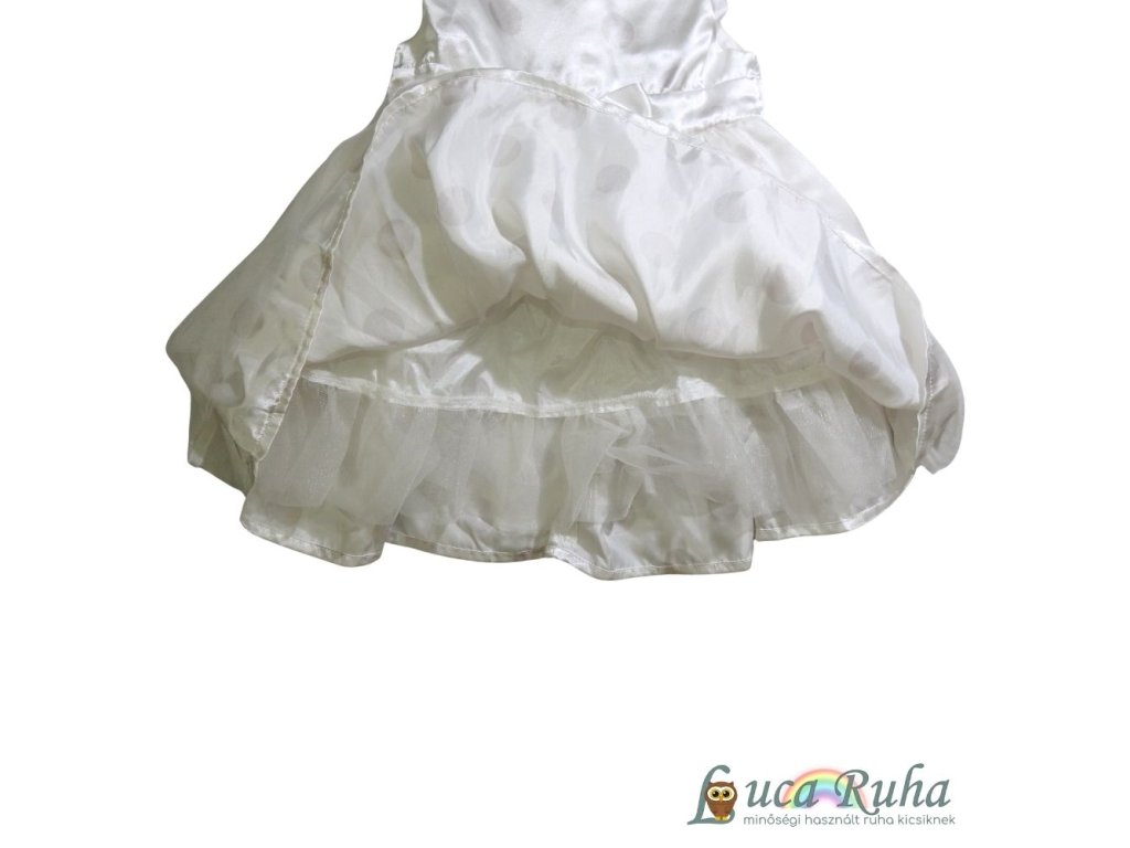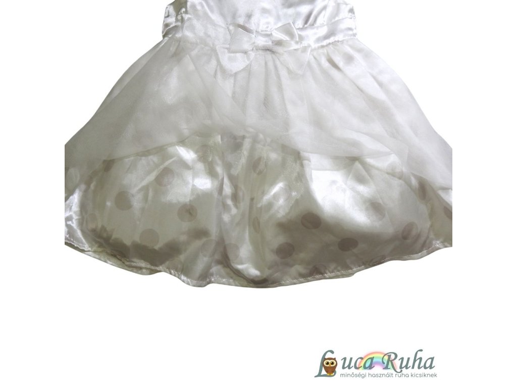 Fehér, ujjatlan, selymes anyagú, pöttyös mintájú alkalmi ruha tüllös szoknyarésszel.