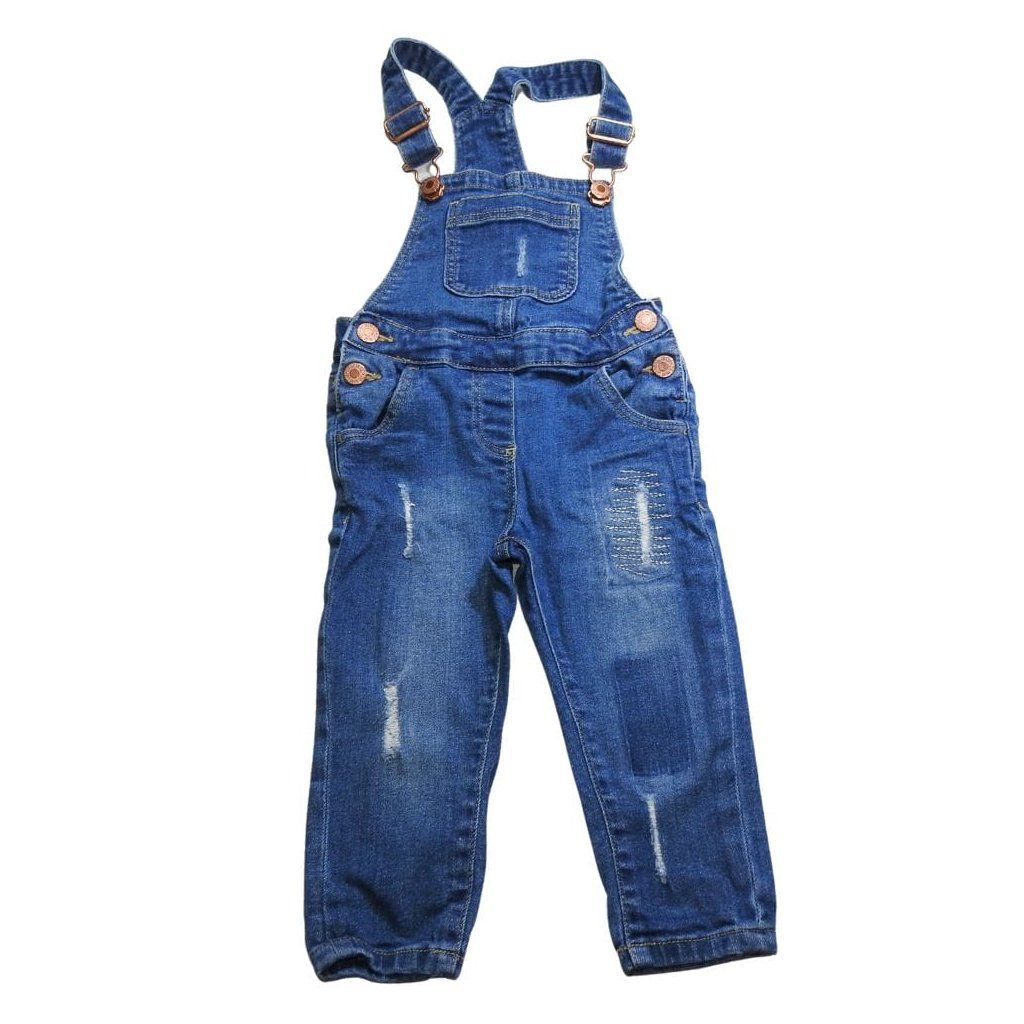 Sötétkék, koptatott, szaggatott stílusú kantáros farmernadrág/kertészfarmer, állítható derékbőséggel.