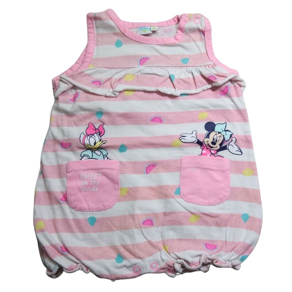 Rózsaszín-fehér csíkos, ujjatlan, húzott szárú, zsebes napozó Minnie egér és Daisy kacsa karakterével.
