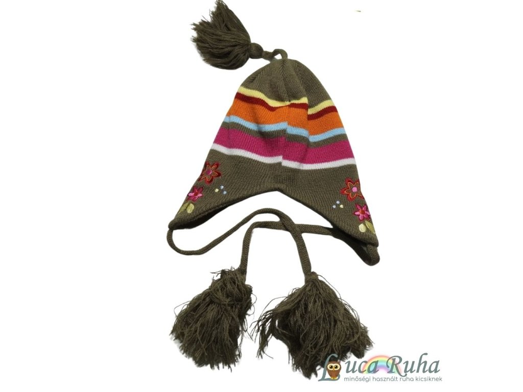 Barna kötött, téli sapka, színes, virágos, csíkos mintázattal, bojttal, megkötővel.
