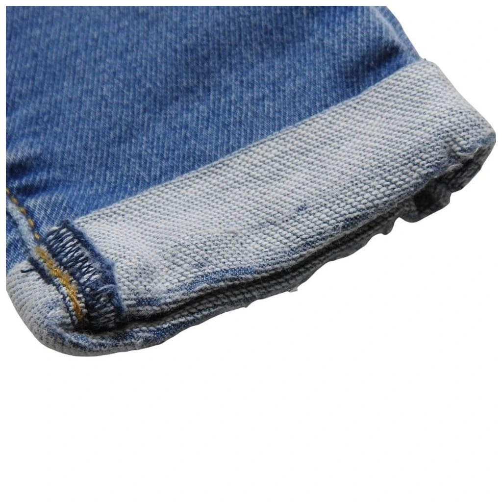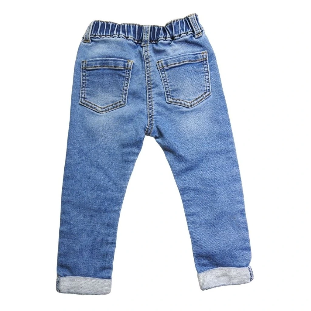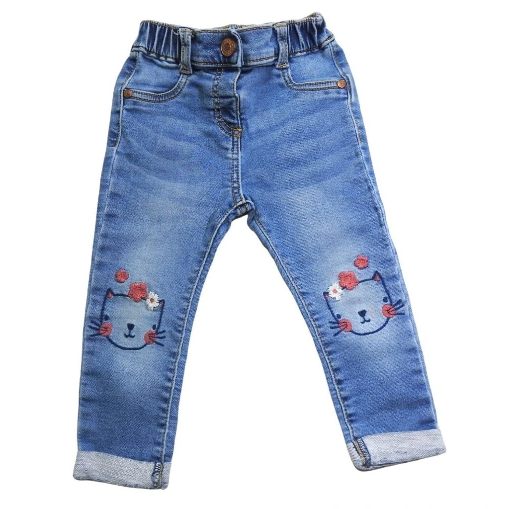Kék, koptatott stílusú, gumírozott derekú farmernadrág térdein hímzett cicás mintával.