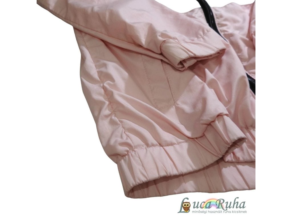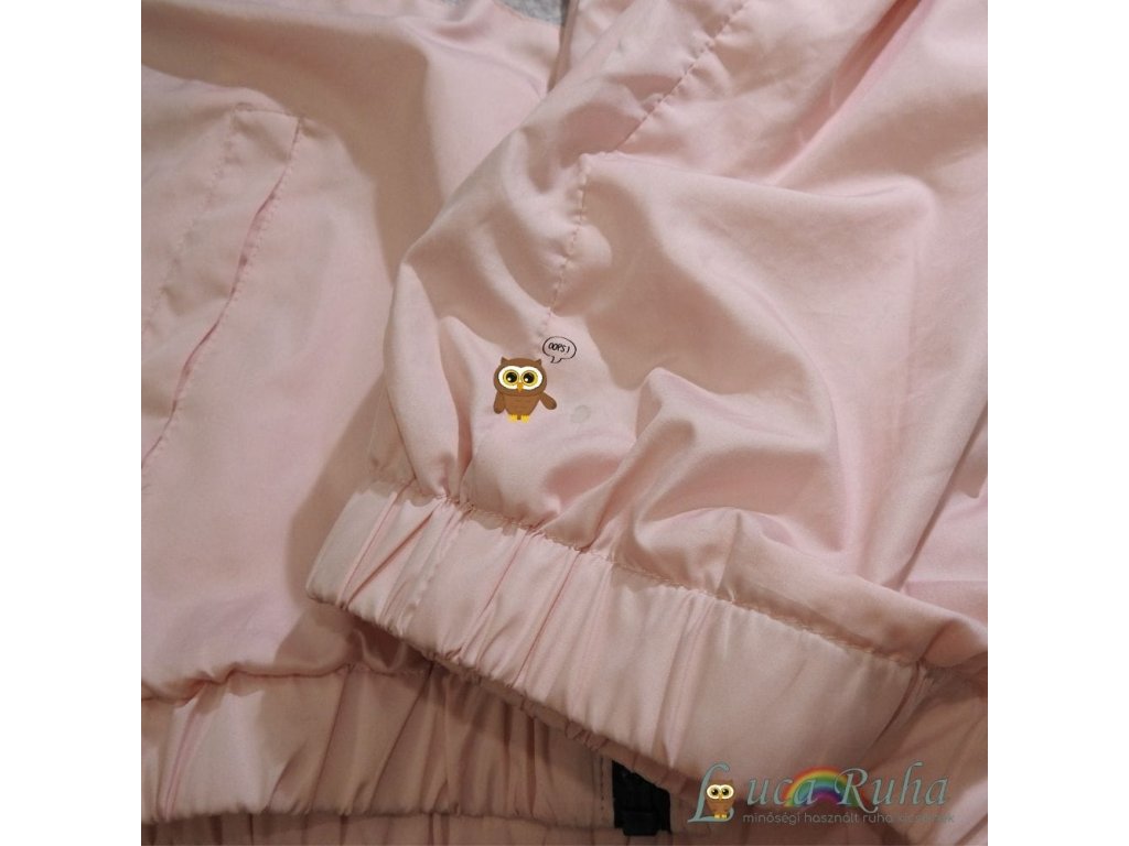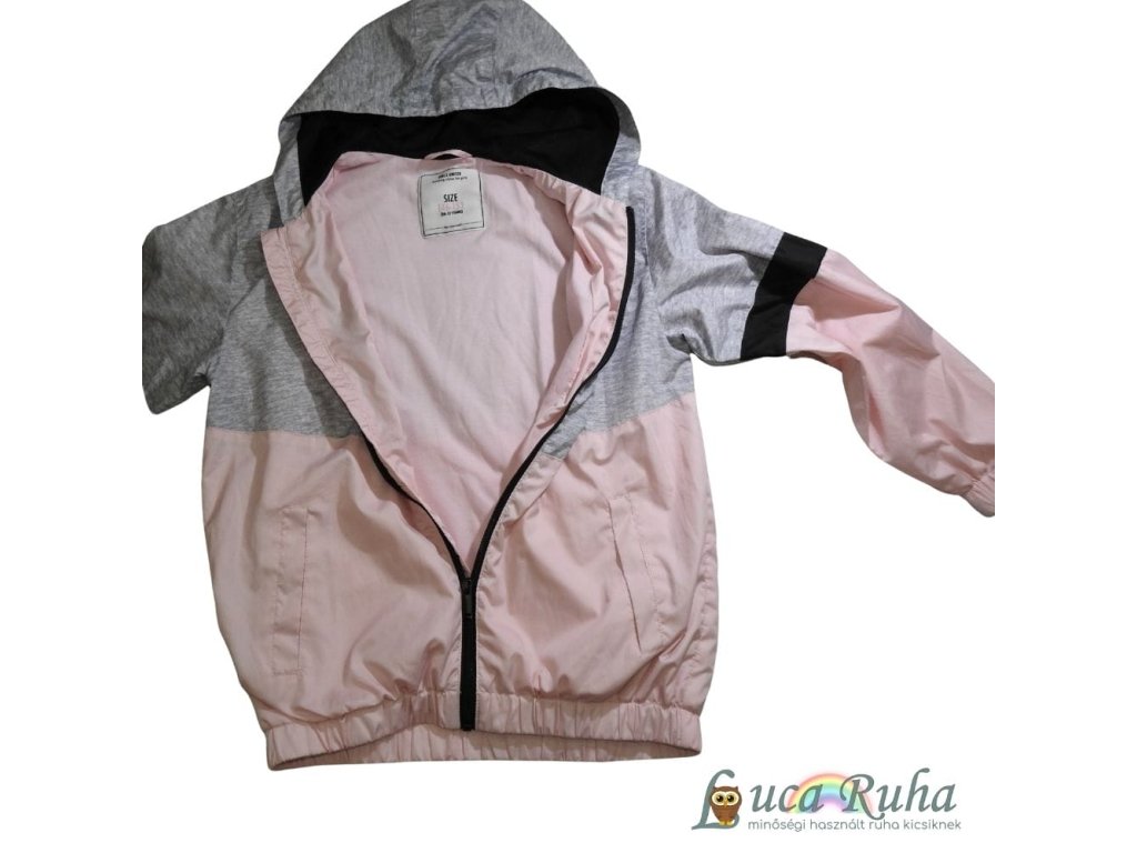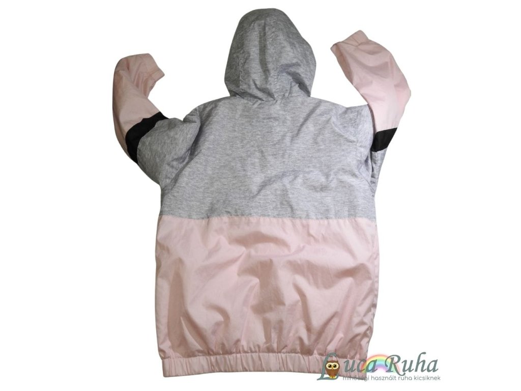 Rózsaszín-szürke, kapucnis, pamuttal bélelt széldzseki.