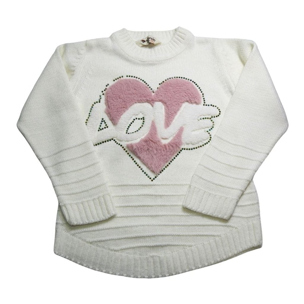 Fehér, kötött pulóver plüss szíves mintával, strasszokkal.