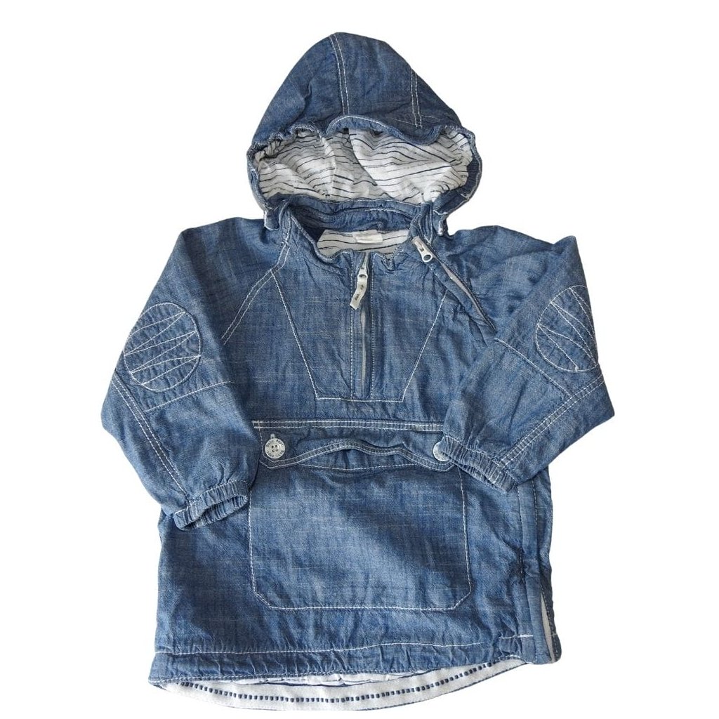 Kék, farmerhatású, kék-fehér tengerész stílusú pamuttal bélelt, több cipzáras dzseki.
