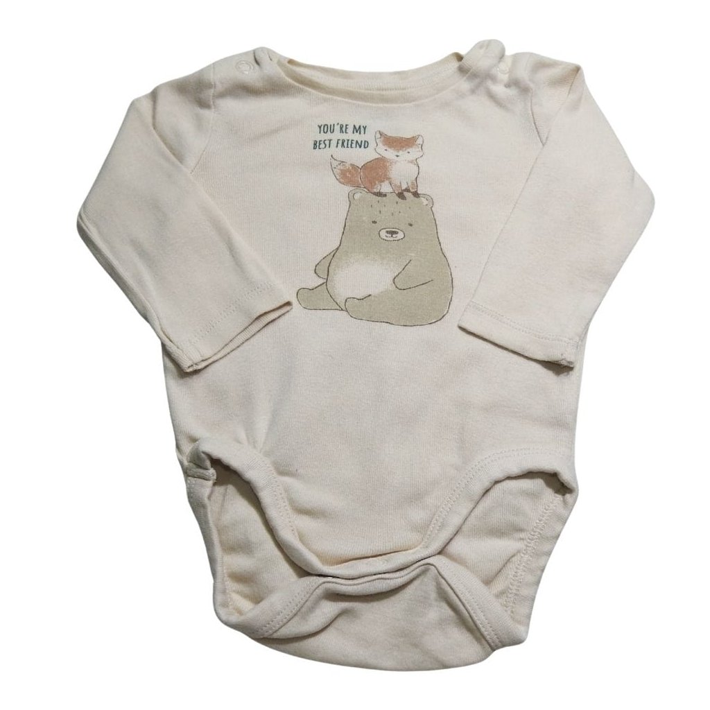Krém (natúr) színű, hosszú ujjú pamut body macis, rókás mintával.