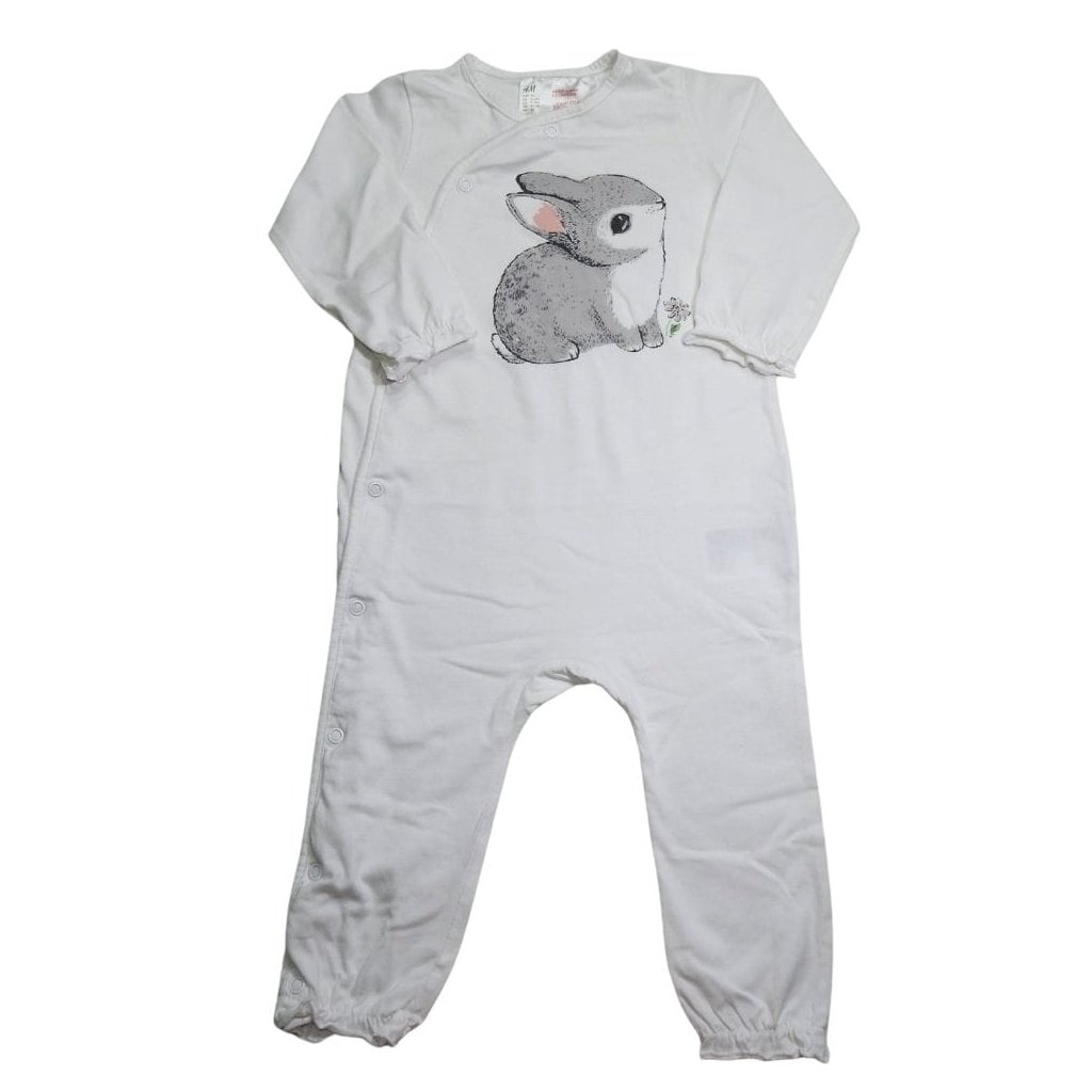 Fehér, húzott hosszú ujjú és szárú pamut kezeslábas/pizsama nyuszis mintával.