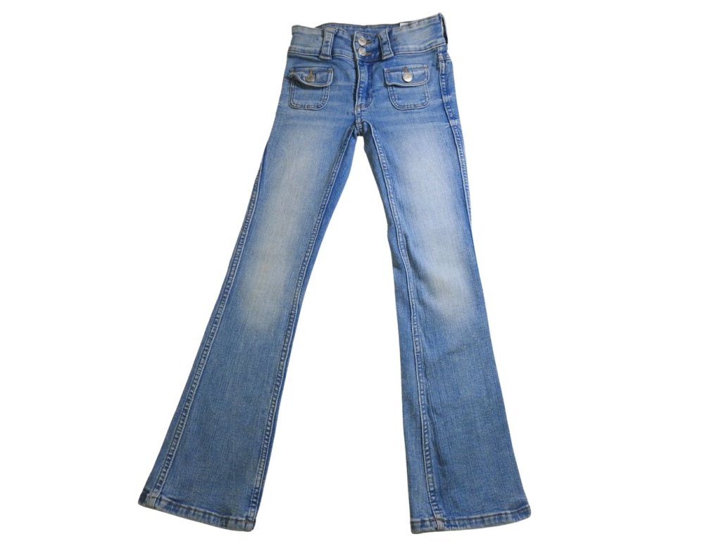 Világoskék trapéz szárú farmernadrág, állítható derékbőséggel.
