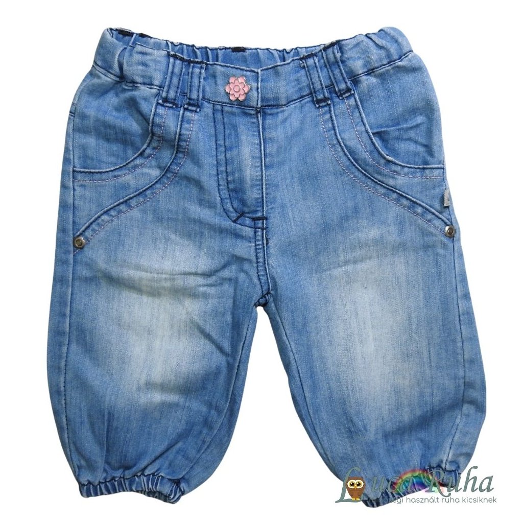 Világoskék, állítható derekú farmernadrág, hímzett virágmintával.
