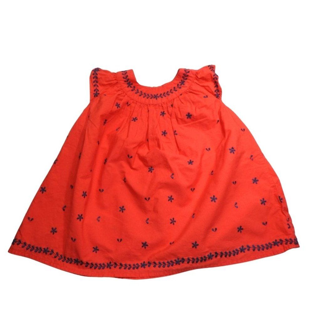 Piros, ujjatlan pamut ruha kék, hímzett virágos mintázattal.