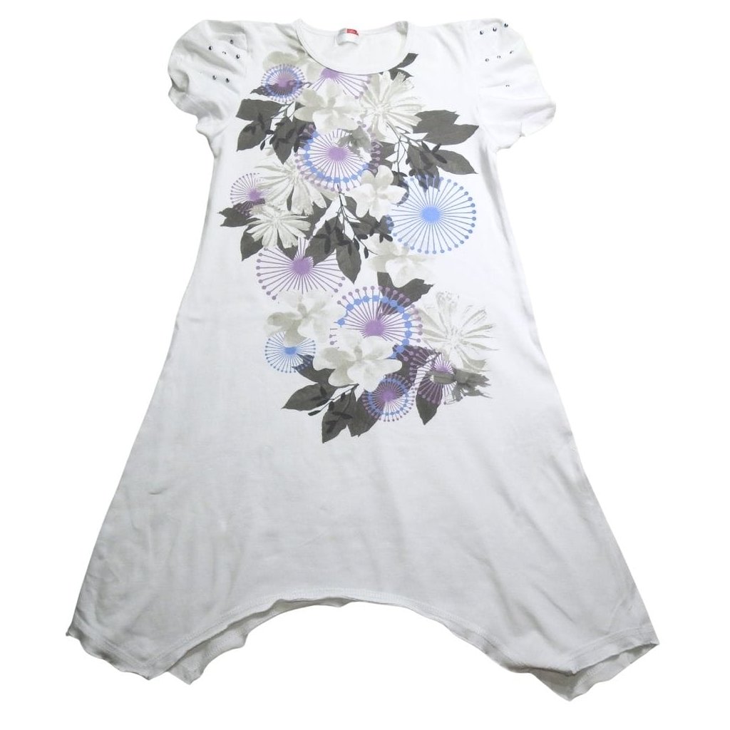 Fehér, rövid ujjú, aszimmetrikus, pamut tunika/hosszított felső virágos mintázattal, ujjain díszítéssel.