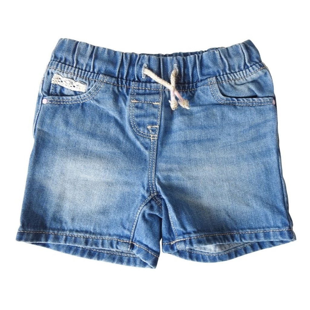 Kék, koptatott stílusú, gumis derekú pamut, farmer rövidnadrág megkötővel, csipkés részlettel.