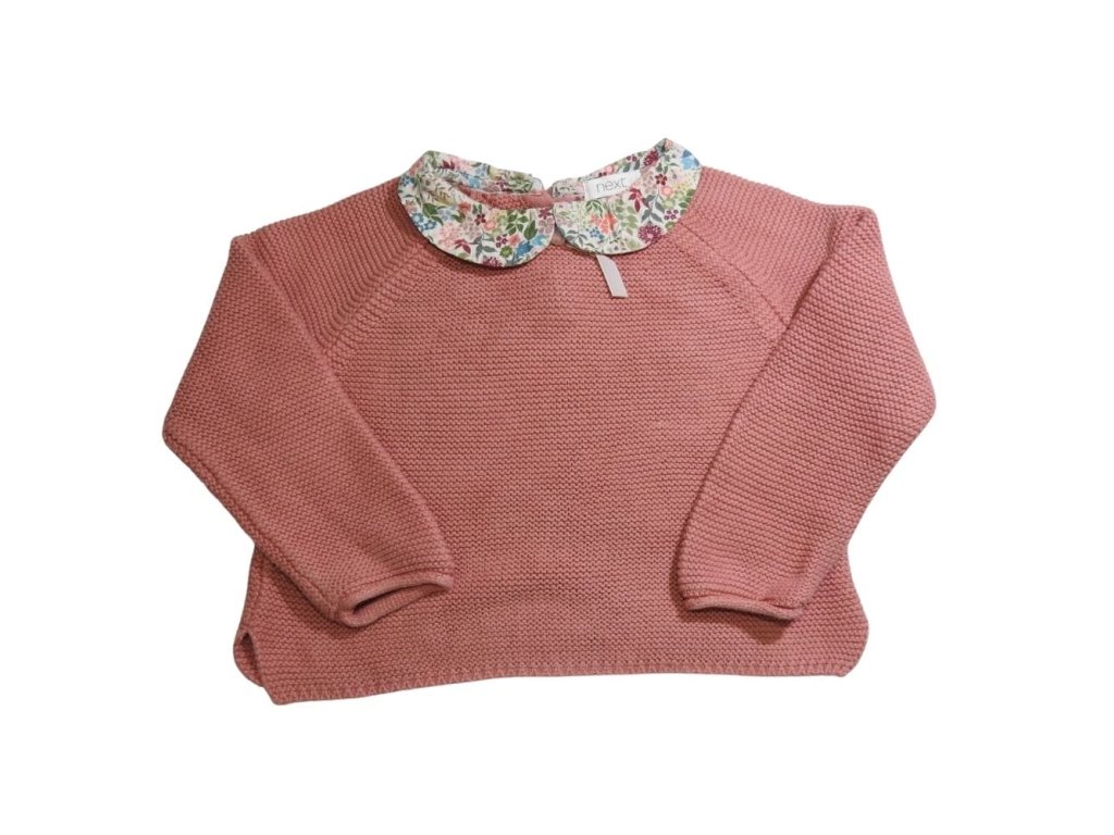 Sötét rózsaszín, kötött pulóver, virág mintás gallérral.