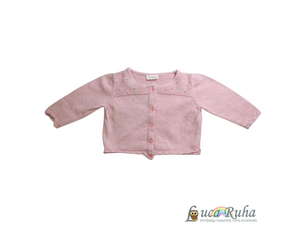 Rózsaszín, kötött kardigán hímzett virágos mintával.
