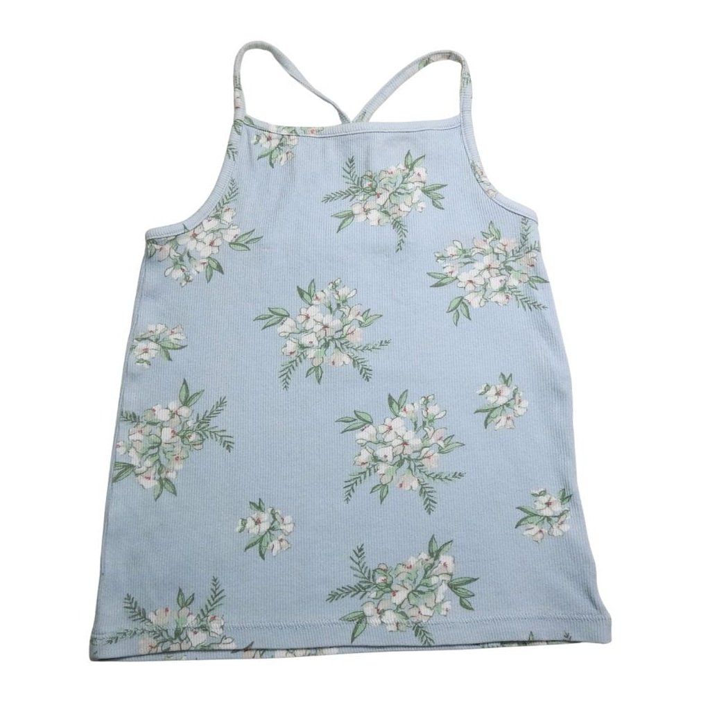 Világoskék, hátul kereszt, spagetti pántos, bordázott pamut anyagú top/trikó virágos mintával.