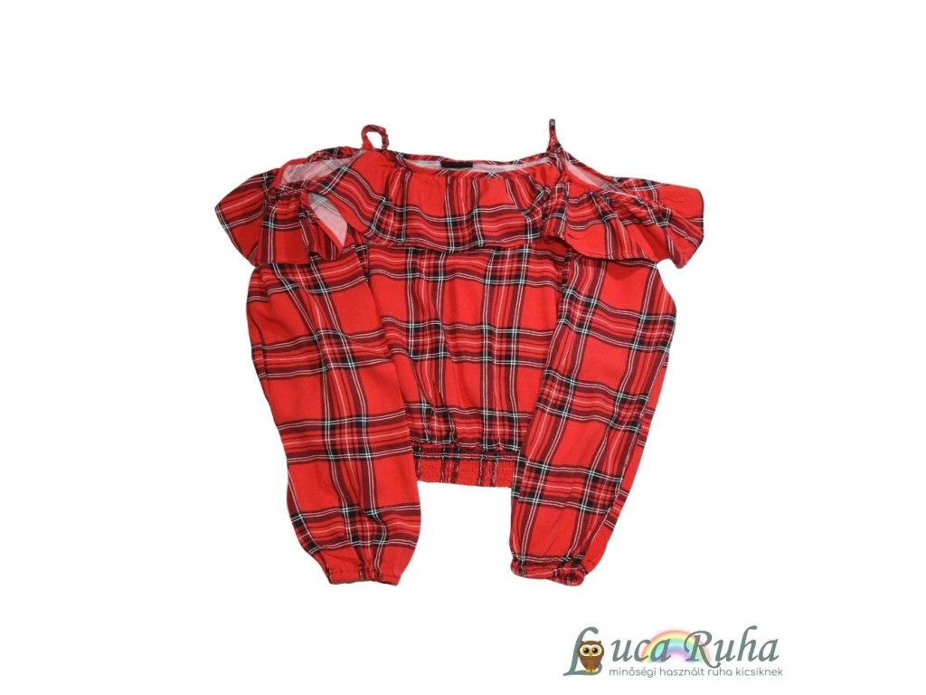 Piros kockás, rövid szabású, hosszú ujjú, nyitott vállú felső fodorral.