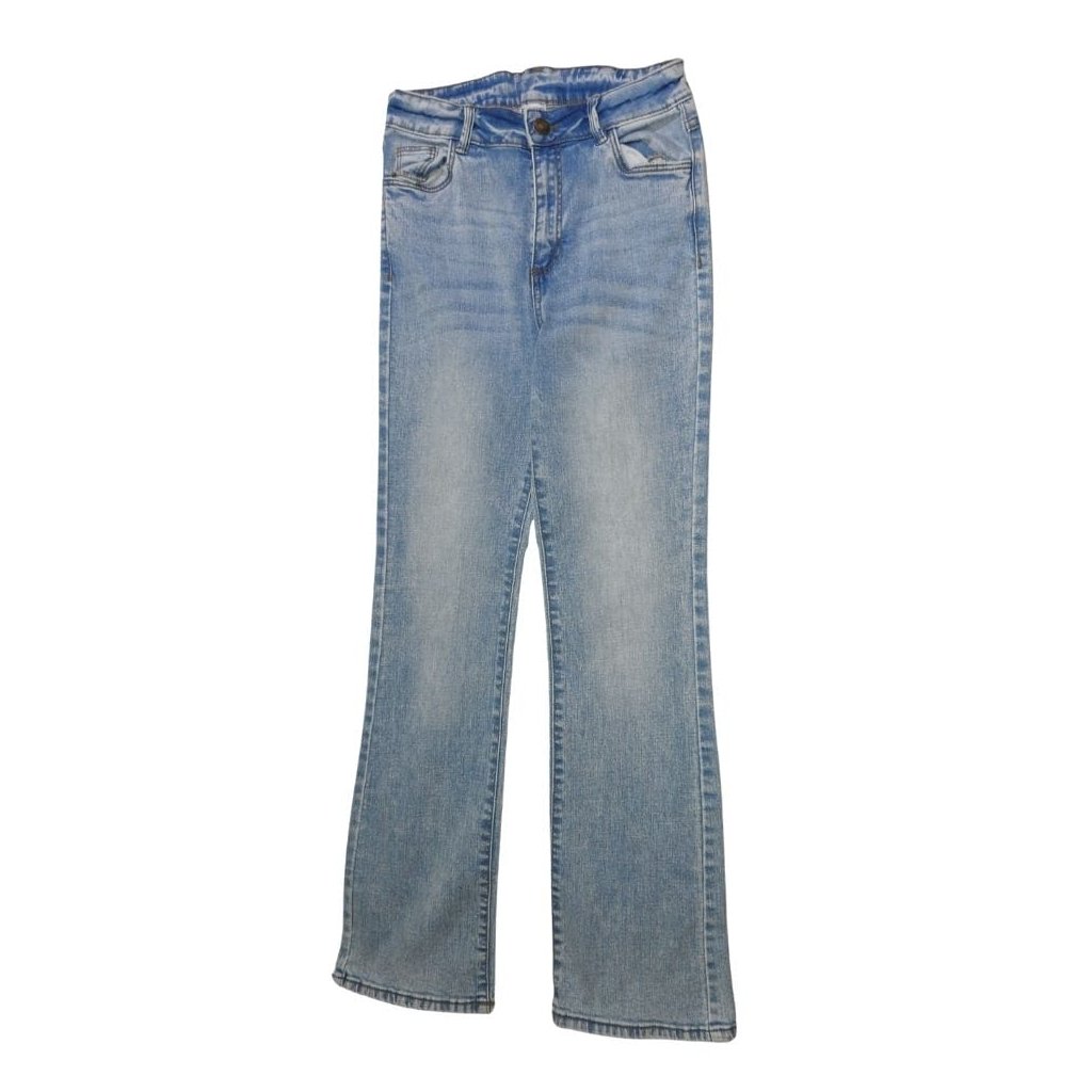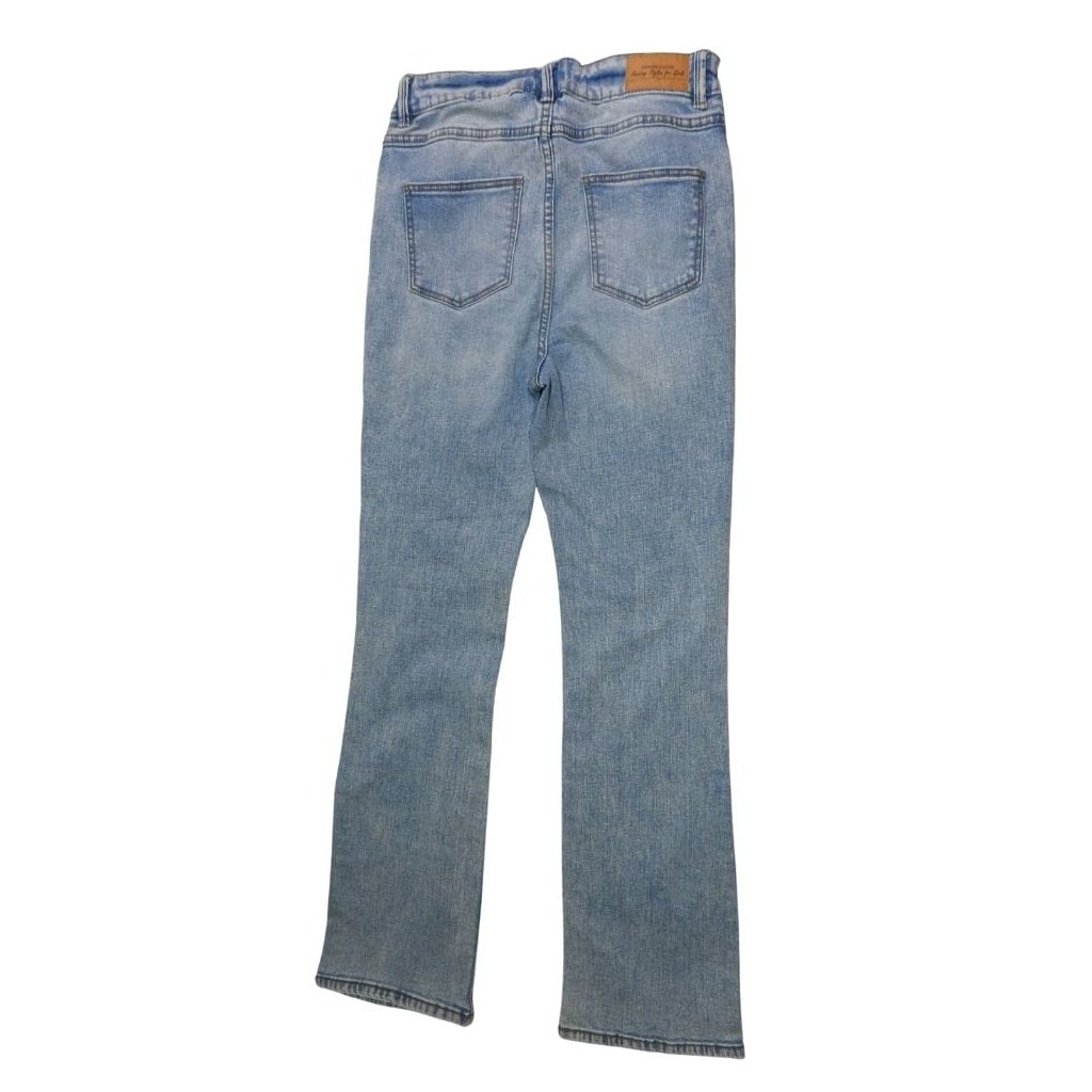 Világoskék, koptatott stílusú, trapéz szárú farmernadrág állítható derékbőséggel.
