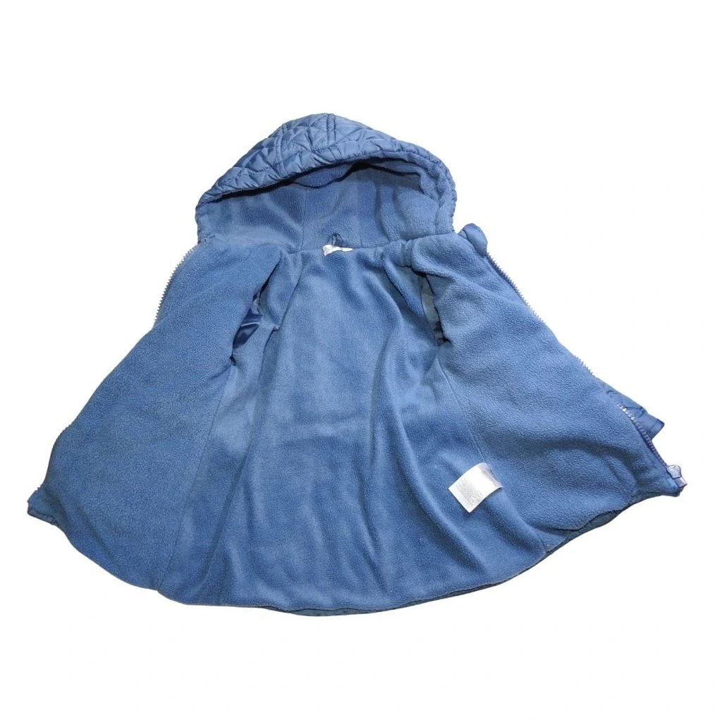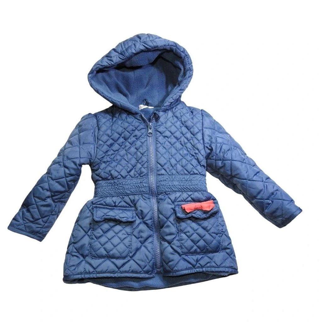 Kék, kapucnis, steppelt, polár bélelt átmeneti kabát masni dísszel.