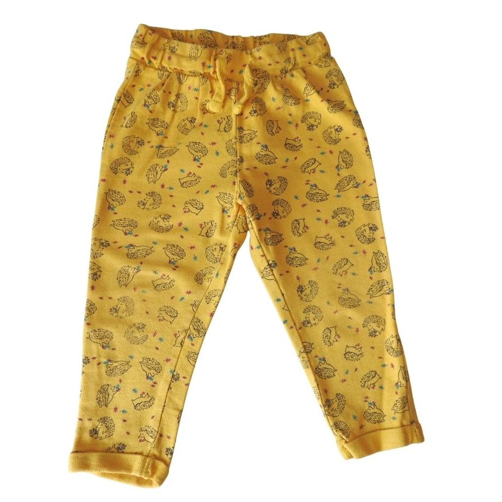 Sárga melegítőnadrág sünis mintázattal.