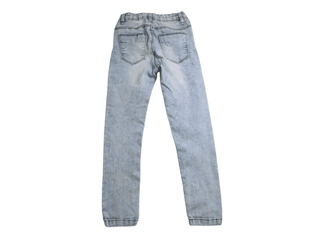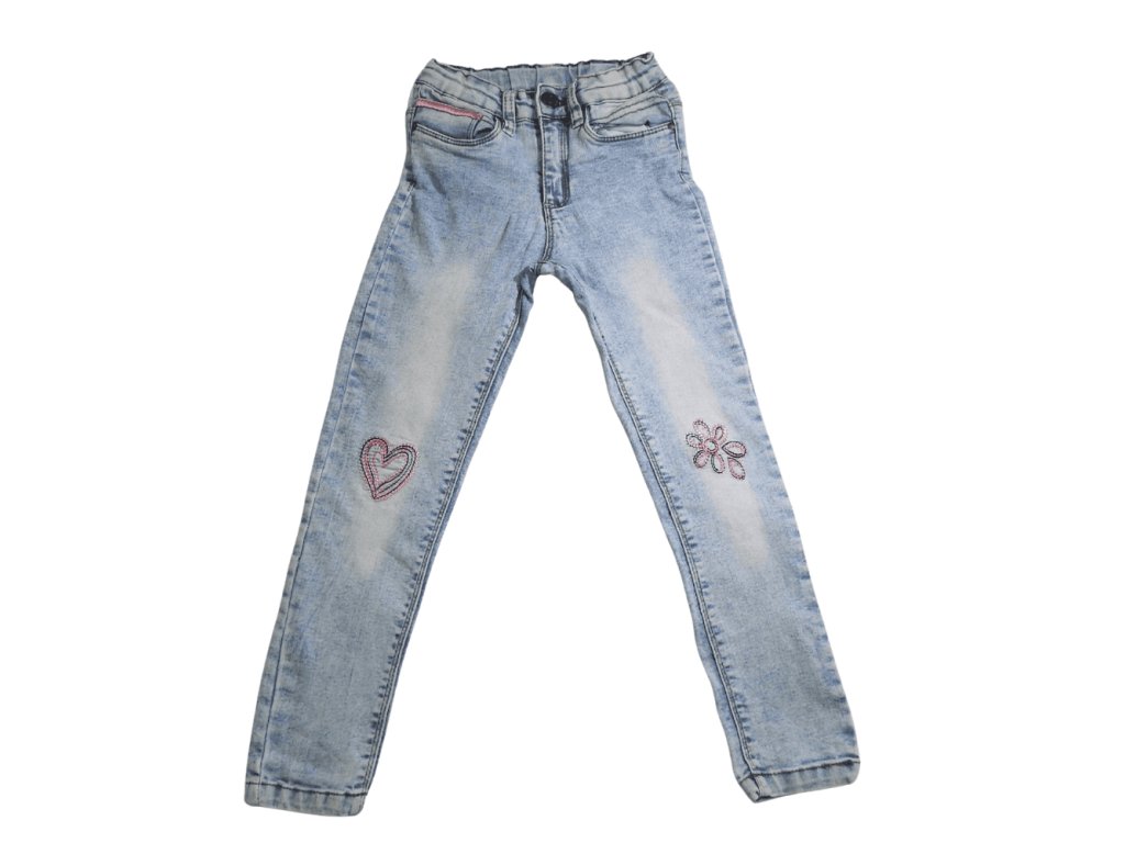 Világoskék farmernadrág, állítható derékbőséggel, hímzett mintával.