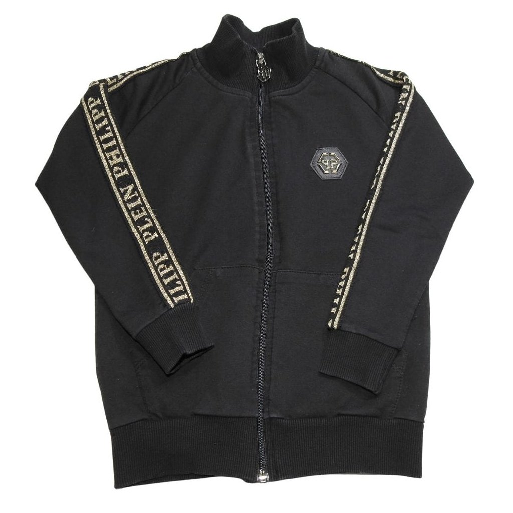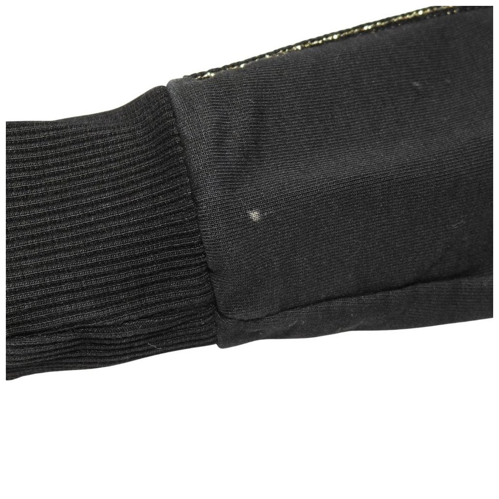 Fekete pamut pulóver, kapucnival, cipzáras záródással, ujjain aranyozott díszítéssel, hátán strasszokkal.