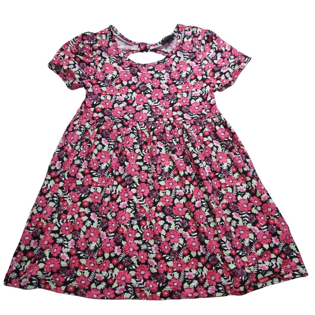 Fekete alapon, sűrű pink virágmintás, rövid ujjú lányka ruha.