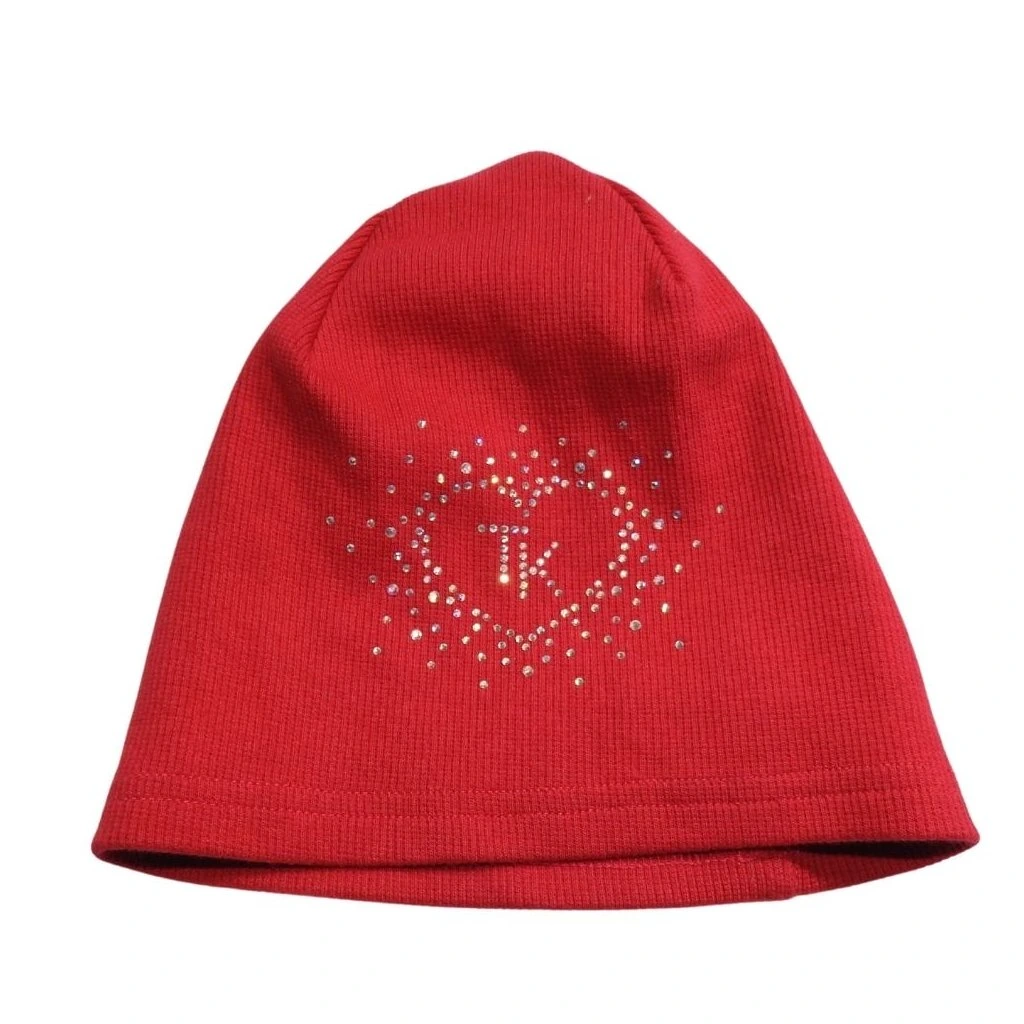 Piros, kötött átmeneti sapka strasszos díszítéssel.