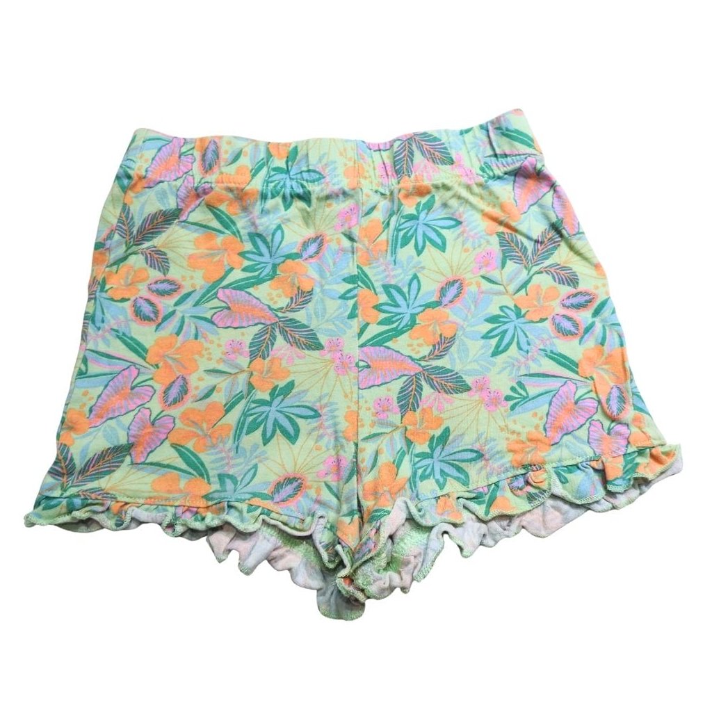 Színes, fodros aljú pamut rövidnadrág trópusi mintázattal.