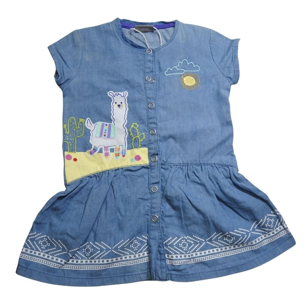 Kék, farmerhatású, rövid ujjú pamut ruha, hímzett, lámás mintával, patentos záródással.