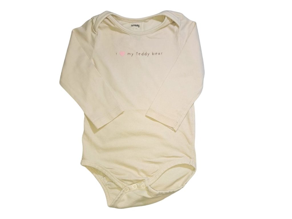 Bézs hosszú ujjú pamut body felirattal.