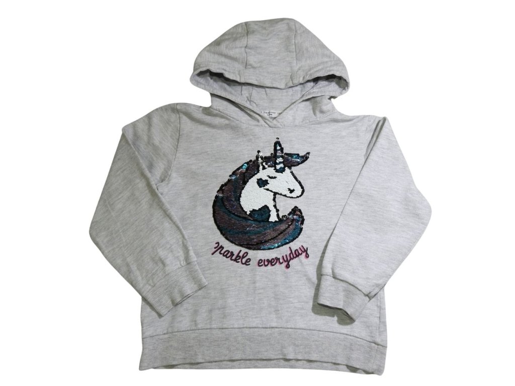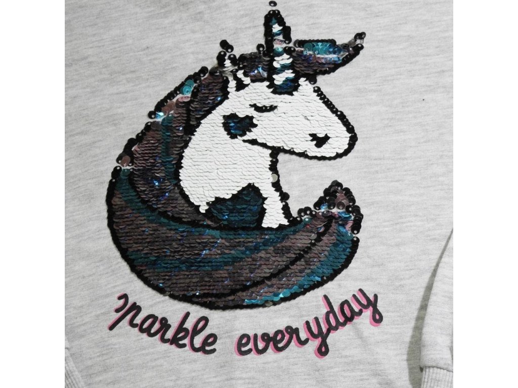 Szürke kapucnis pulóver, flitteres unikornis mintával.
