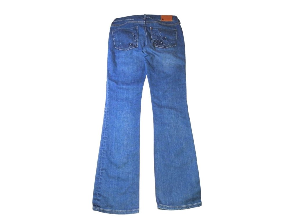 Világoskék, trapézszárú farmernadrág, farzsebein hímzett, köves díszítéssel.