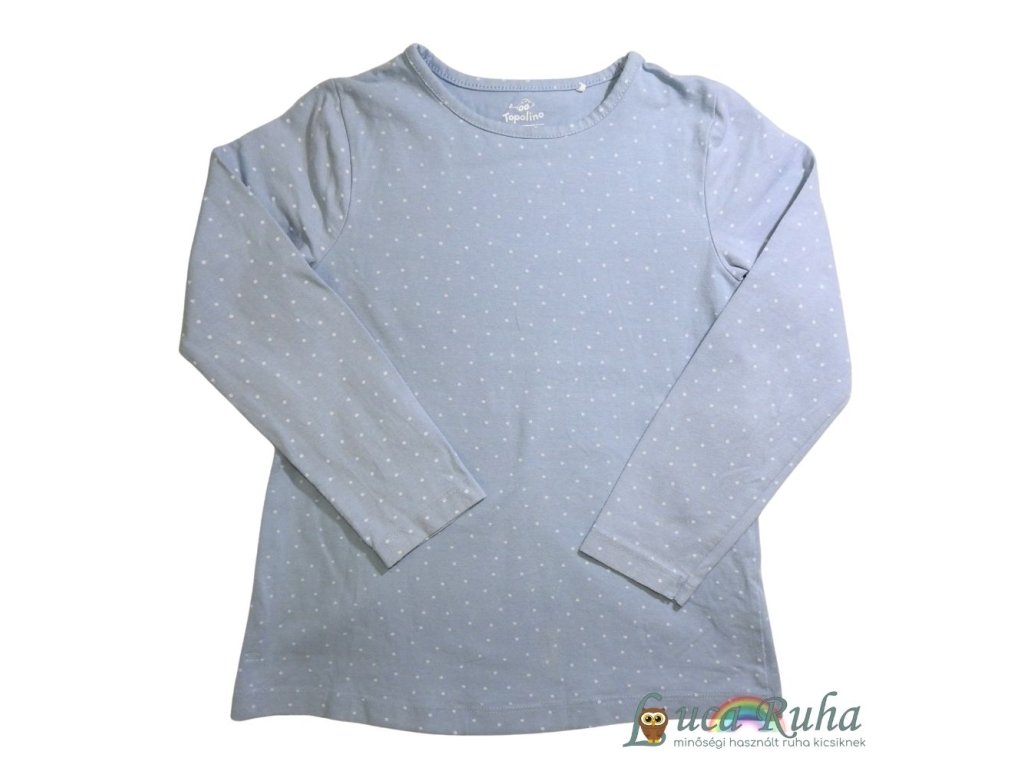 Világoskék, hosszú ujjú felső fehér pöttyökkel.