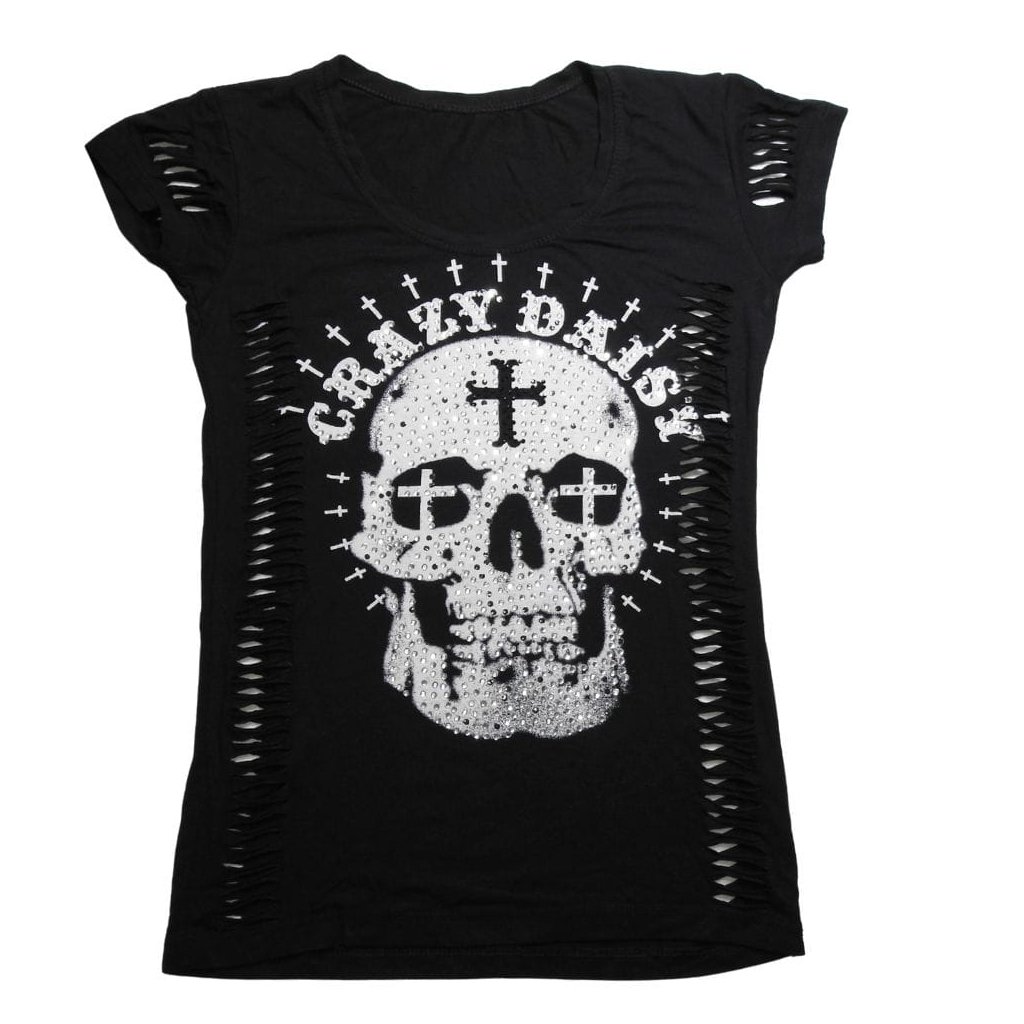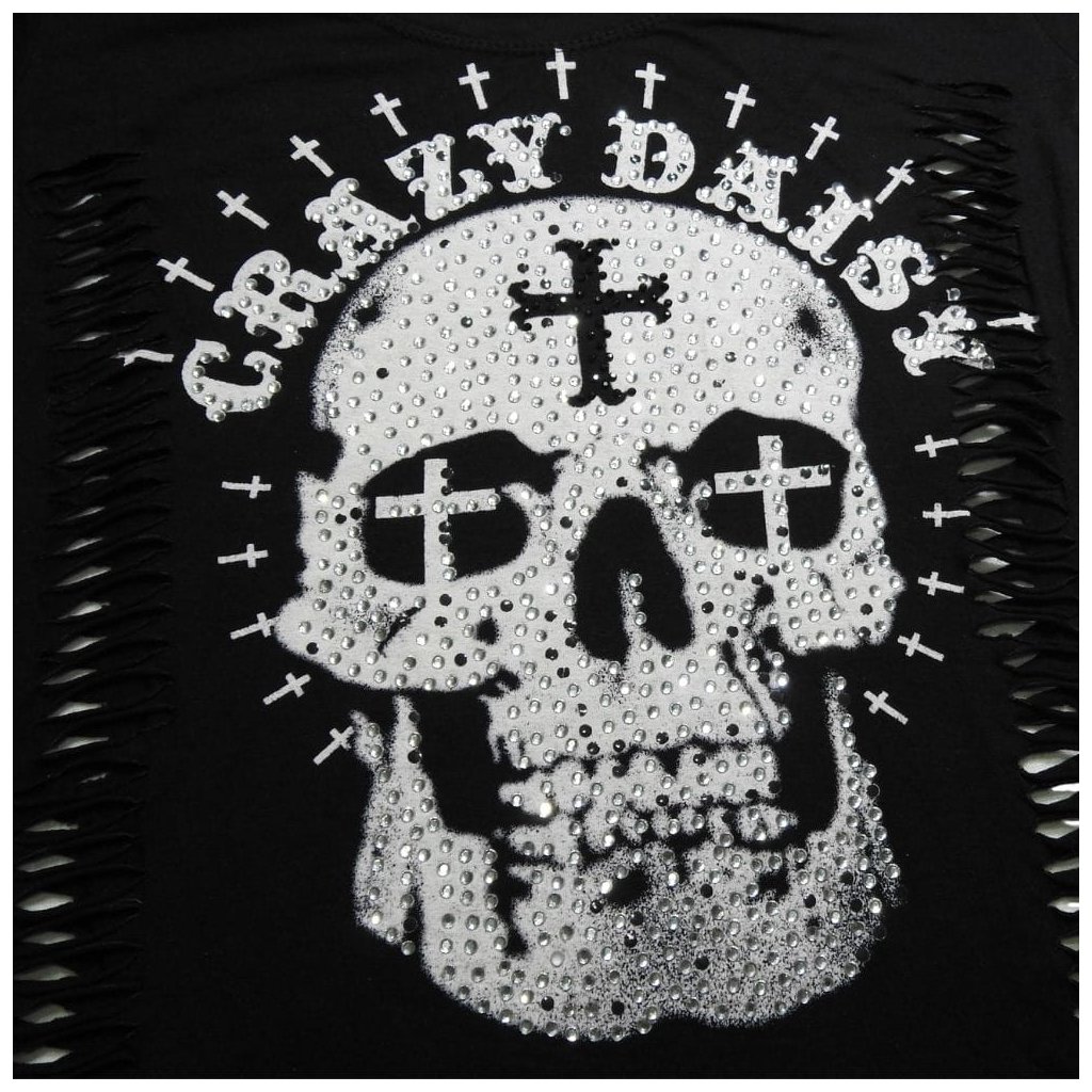 Fekete, rövid ujjú, vagdosott stílusú, strasszkövekkel díszített koponyás felső.