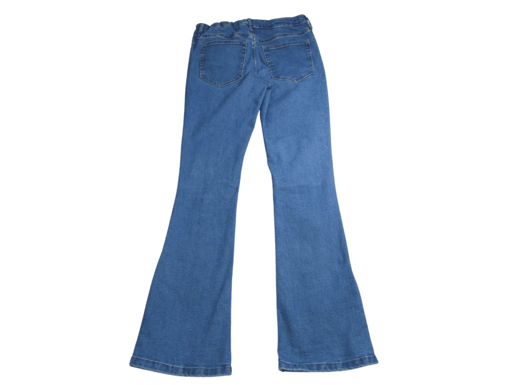 Világoskék, trapéz szárú farmernadrág, állítható derékbőséggel.
