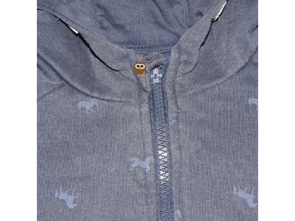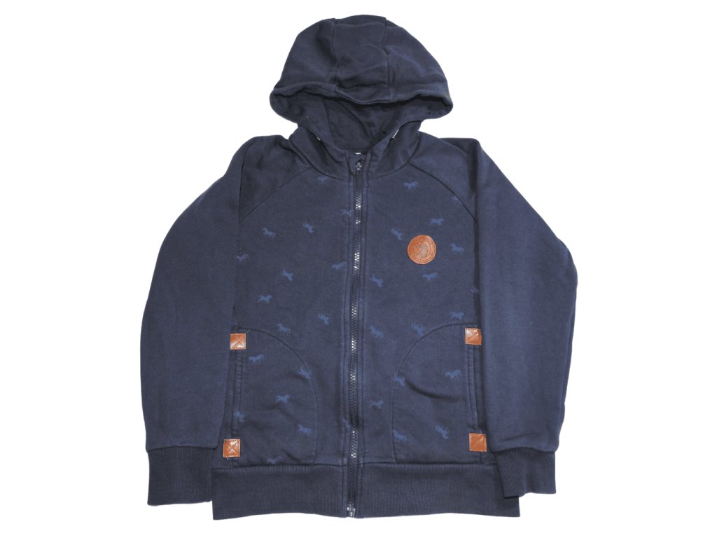 Sötétkék kapucnis pulóver, lovas mintázattal, cipzáras záródással.