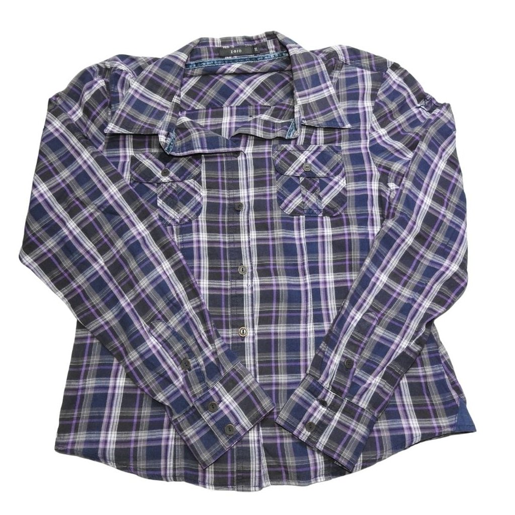 Lila kockás, hosszú ujjú ing.