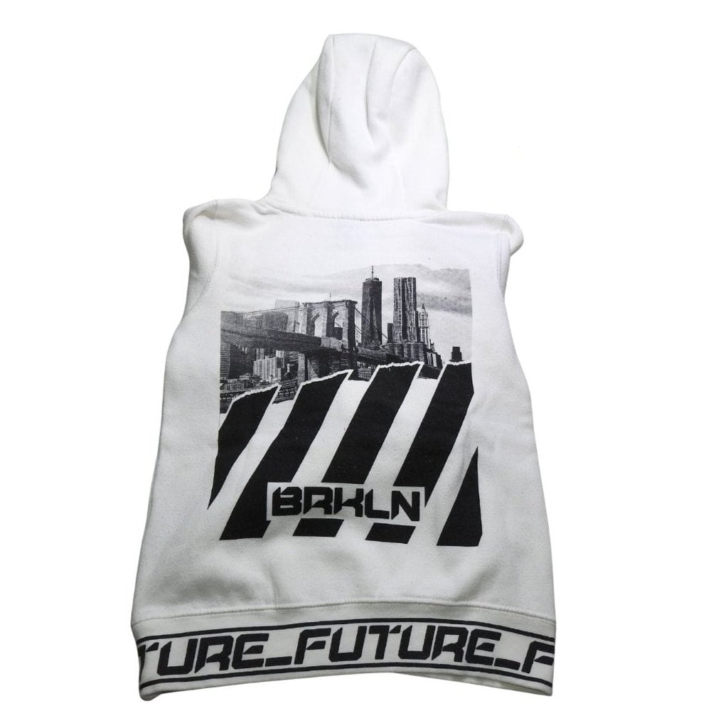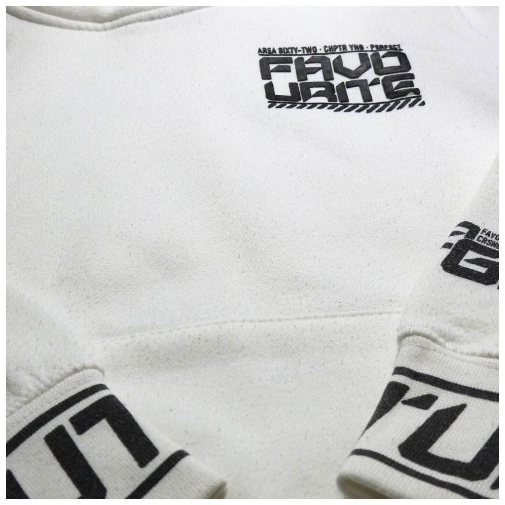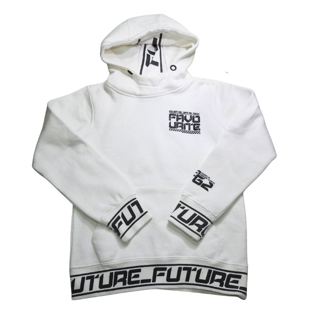 Fehér, kapucnis, kenguruzsebes pulóver feliratokkal, hátul mintával.