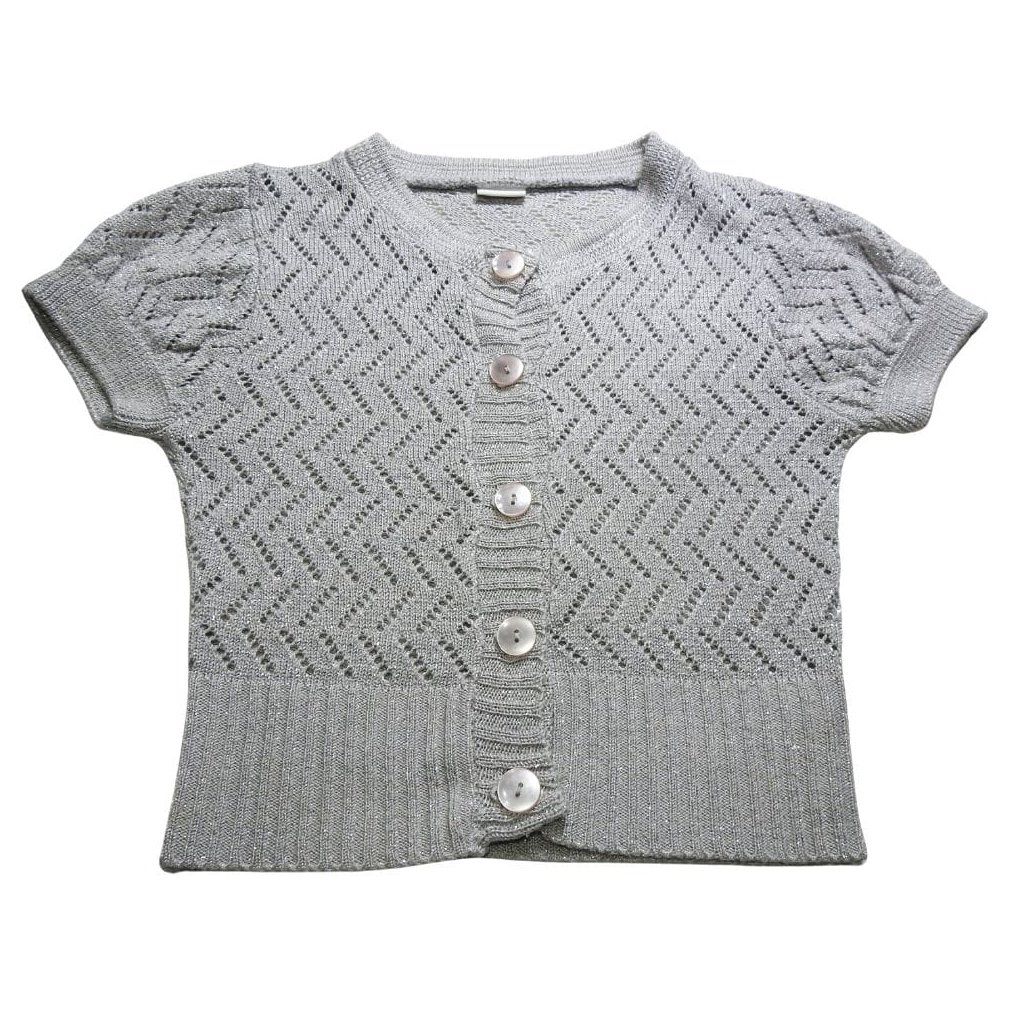 Szürke, rövid ujjú, kötött, anyagában csillámos kardigán.