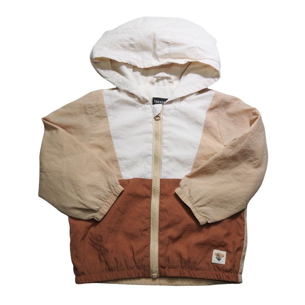 Barna-fehér, kapucnis, pamuttal bélelt dzseki.