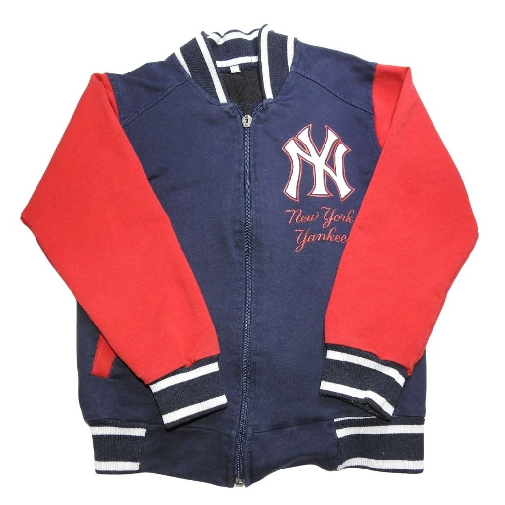 Kék-piros cipzáras pulóver Yankees felirattal, logóval.