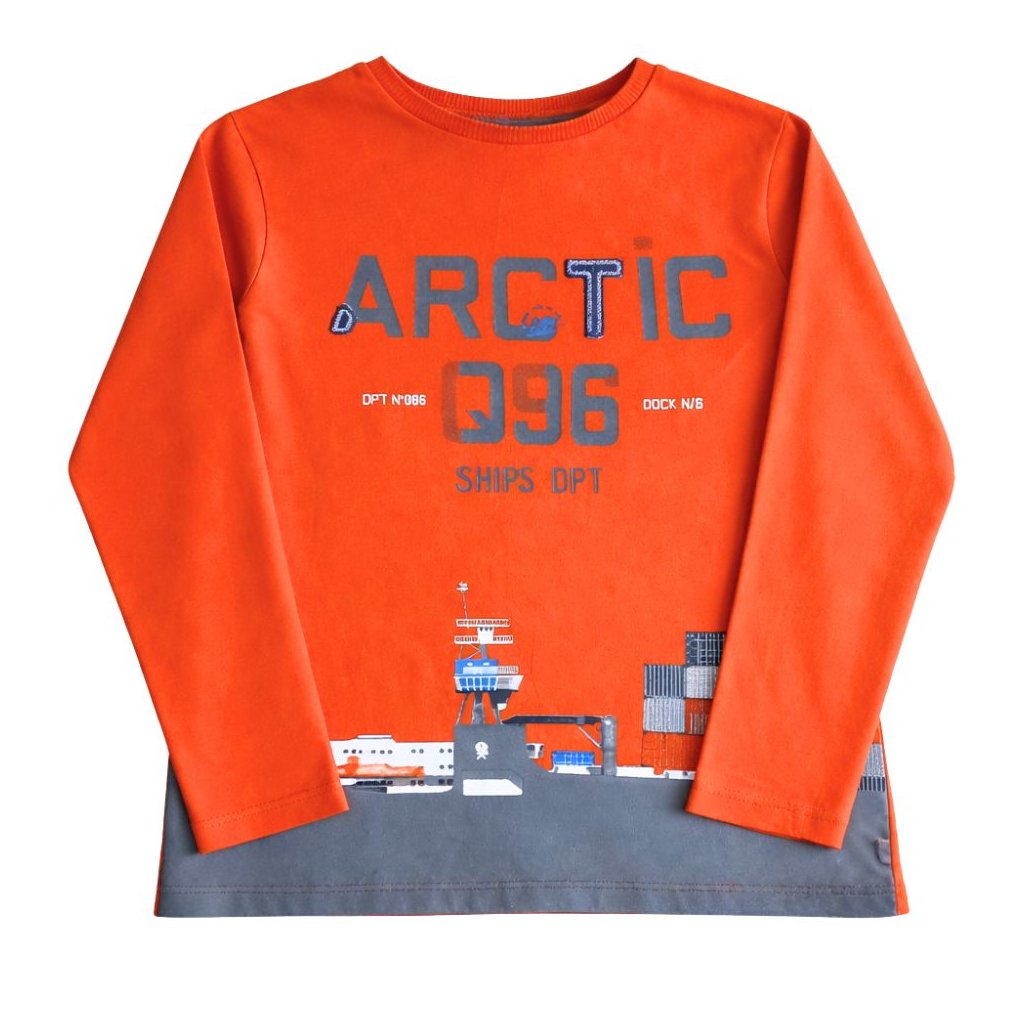 Narancssárga, hosszú ujjú póló nyomott felirattal, mintával.