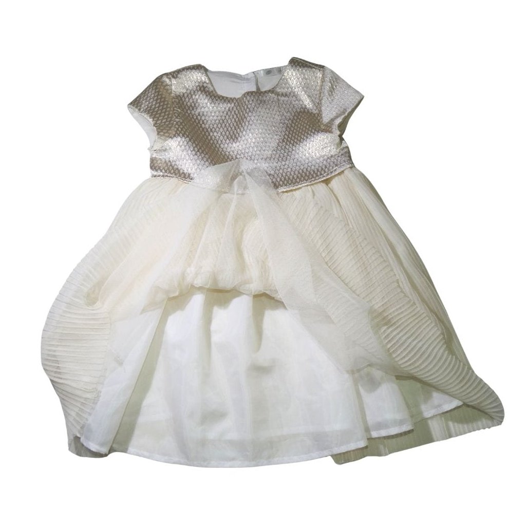 Arany színű rövid ujjú felső rész, és pliszírozott krém színű szoknya rész jellemzi ezt az alkalmi ruhát.