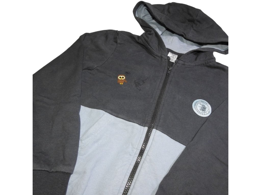Szürke-kék kapucnis pulóver, cipzáras záródással.