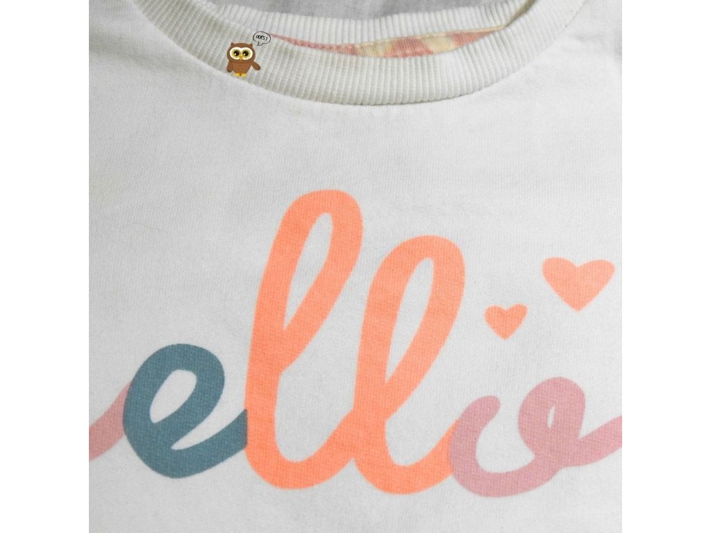 Fehér pamut pulóver, színes, HELLO felirattal.