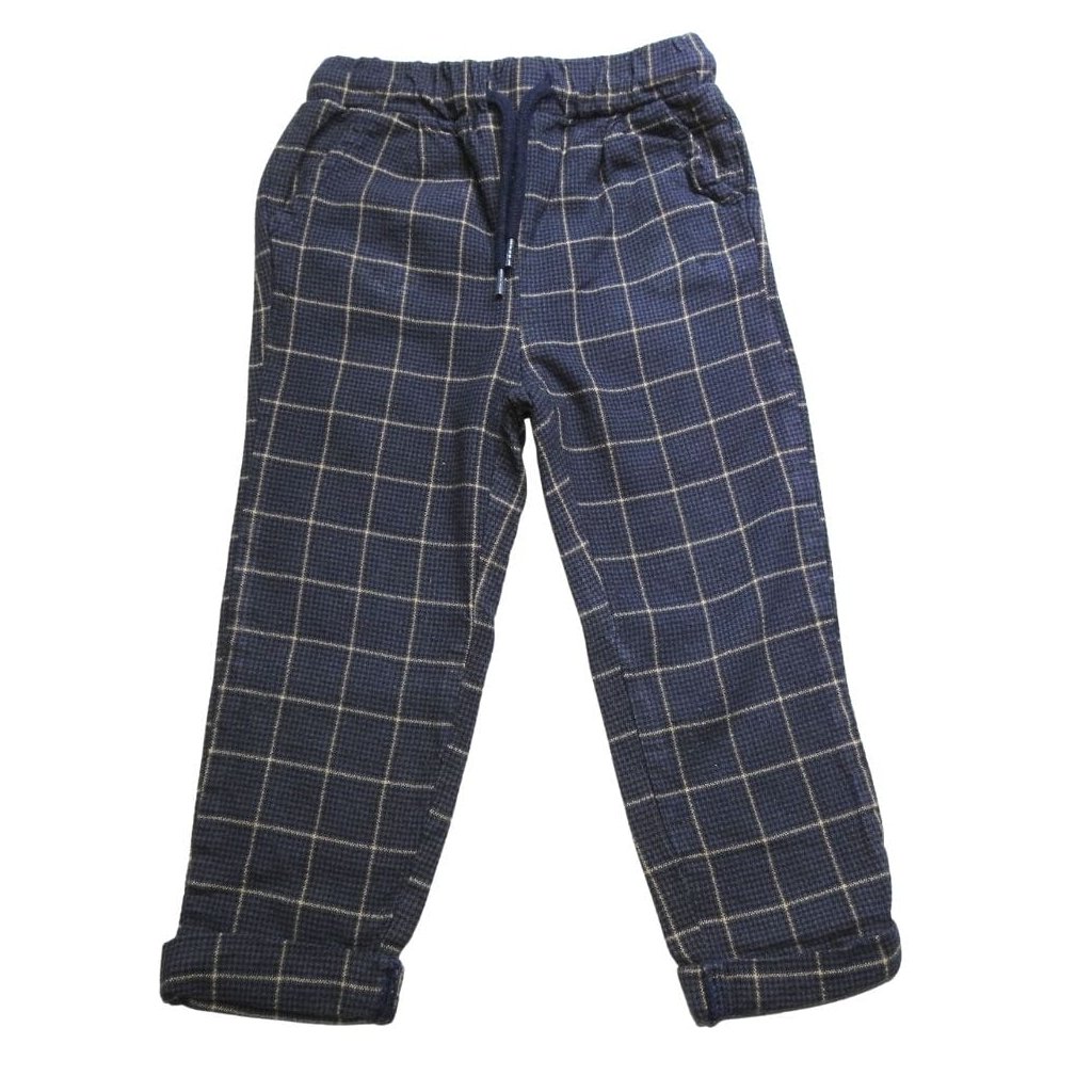 Sötétkék, gumis derekú nadrág kockás mintázattal, megkötővel.